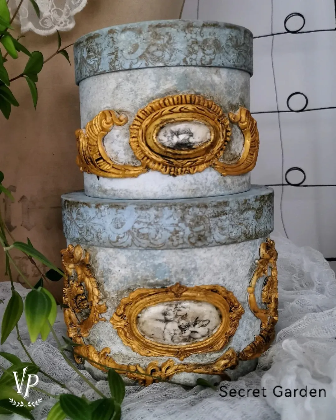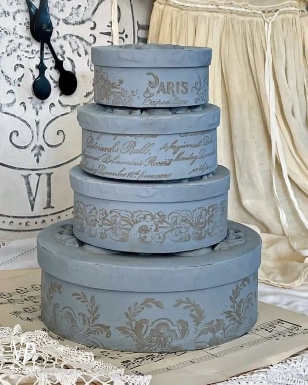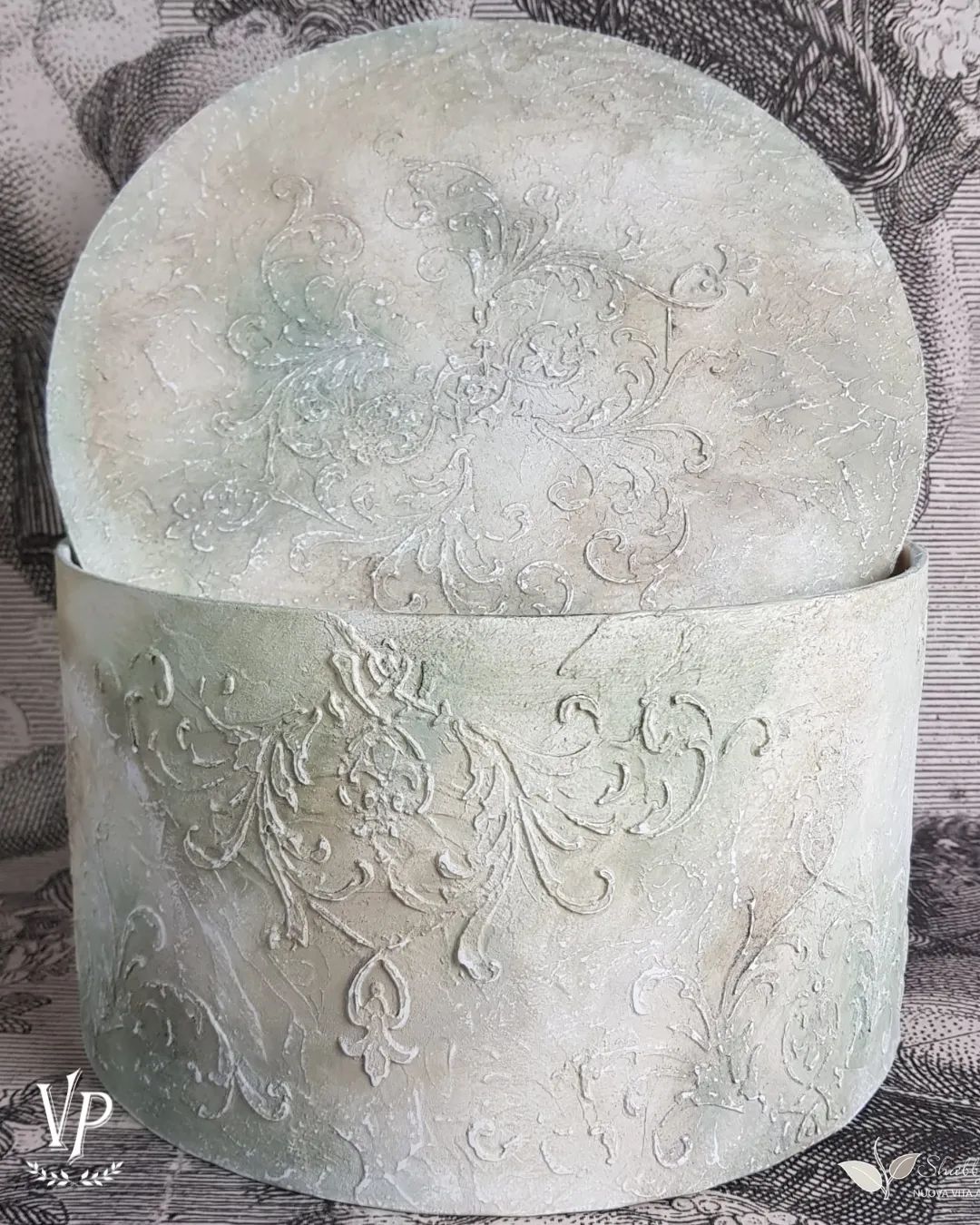 – puoi impreziosirle con uno stencil Vintage, anche in rilievo (è facilissimo usando la polvere materica)